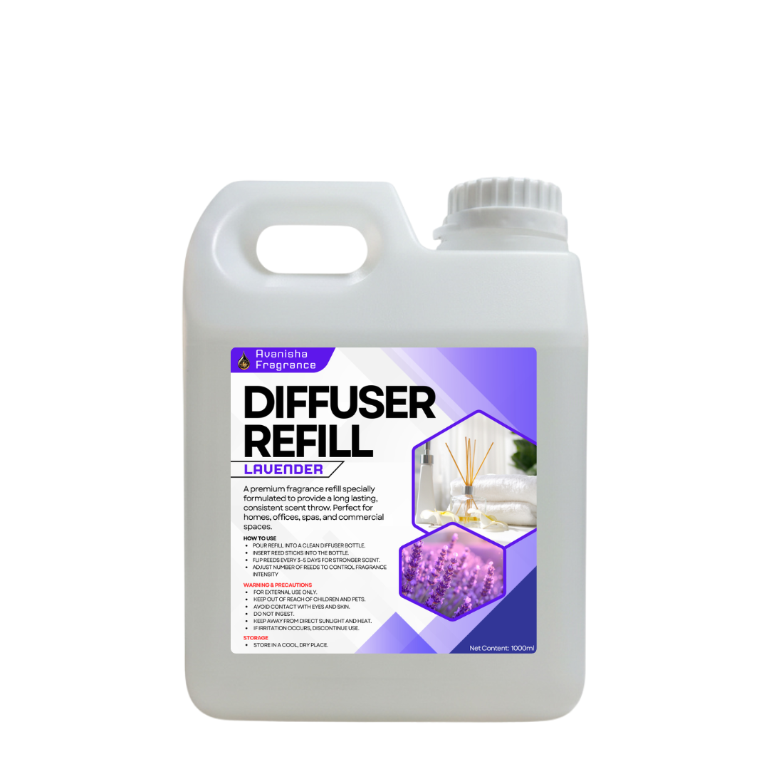 Premium Lavender Diffuser Refill Oil Base for long lasting, elegant home fragrances. Designed for smooth diffusion and consistent scent performance. Long lasting and consistent scent diffusion